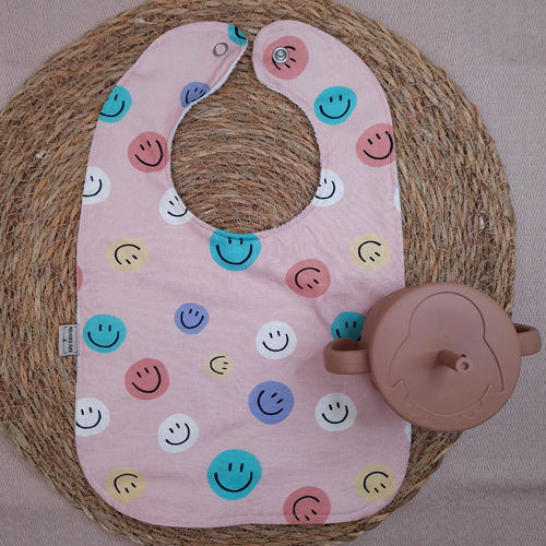 - Kleur: licht roze ondergrond met gekleurde smiles