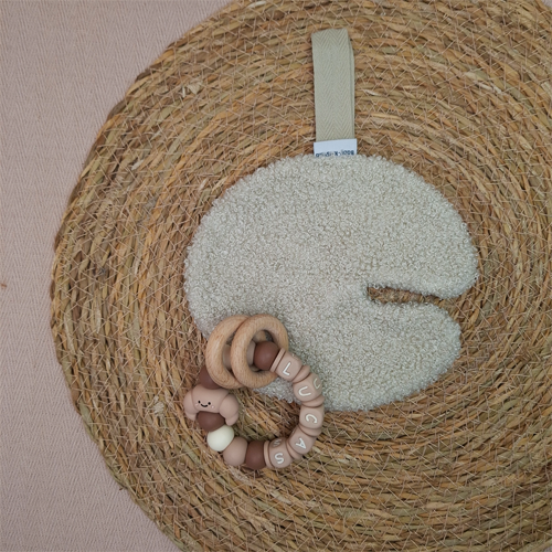 De materialen die ik voor de bijtring met naam gebruik zijn gecertificeerde siliconen kralen. Gemaakt van BPA-vrije, Ftalaten-vrije, lood- en PVC-vrije siliconen kralen. Het houten ringen en kraal zijn van gemaakt van gecertificeerd beukenhout.