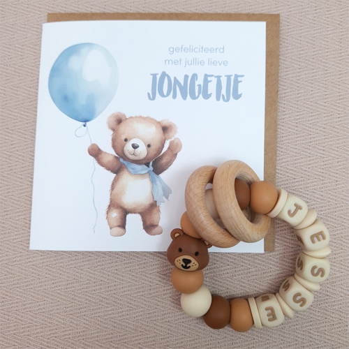 Wij verpakken de bijtring met naam altijd feestelijk als een brievenbus kraamcadeau. Tijdens het afrekenen heb je de mogelijkheid om een door ons geselecteerde kaart toe te voegen voor een kleine meerprijs. Je kunt jouw sbijtring met naam ook rechtstreeks naar de gelukkige ouders sturen met een persoonlijk geschreven kaartje! (De tekst kun je bij het opmerkingenveld schrijven). Handig als je zelf geen tijd hebt om op kraamvisite te gaan of als de kersverse ouders en baby ver weg wonen