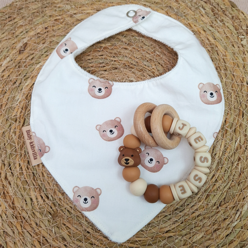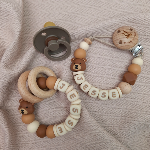 De bijtring is veilig babyspeelgoed. De handgemaakte siliconen bijtring met naam is waar je baby op kan kauwen, sabbelen, ernaar kan grijpen en naar de mond bewegen. Door de houten ringen maakt de bijtring een zacht rammelend geluid, wat het extra leuk babyspeelgoed maakt. In deze blog lees je meer Waarom een siliconen bijtring helpt