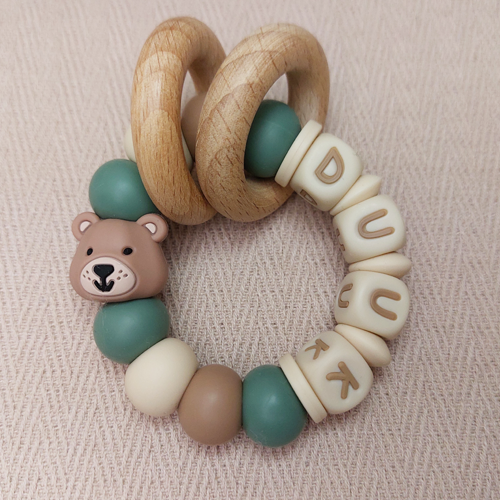 De bijtring met naam beer donker oudgroen, is een perfect kraamcadeau. Met de persoonlijke touch de naam van de baby op de bijtring maakt het tot een uniek geheel. Dit unieke handgemaakte bijtring wordt speciaal door mij ontworpen en samengesteld in mijn eigen atelier.