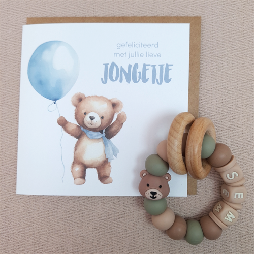 Tip: Combineer je bestelling direct bij de personalisatie van de bijtring, zodat alles perfect bij elkaar past. Zo maak je in één keer een uniek en persoonlijk kraamcadeau.