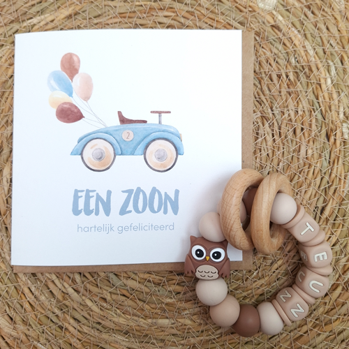Tip: Combineer je bestelling direct bij de personalisatie van de bijtring, zodat alles perfect bij elkaar past. Zo maak je in één keer een uniek en persoonlijk kraamcadeau.