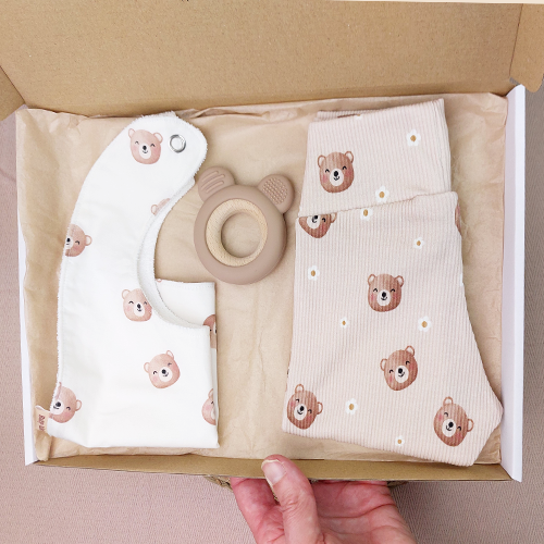 Dit complete setje bestaat uit een zachte babyslab en een comfortabel babybroekje (legging) met beren, gecombineerd met een siliconen bijtspeelgoed beer zacht bruin. Zo geef je niet alleen iets moois, maar ook iets wat echt gebruikt gaat worden.