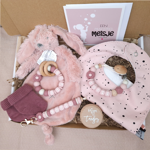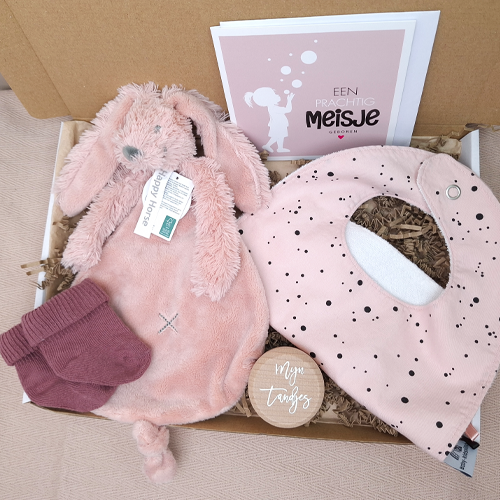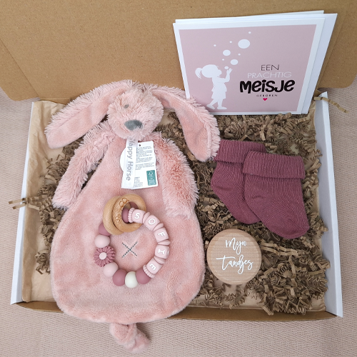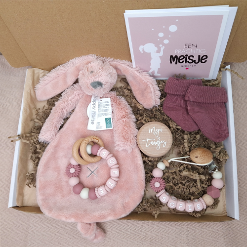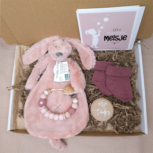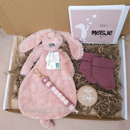 Verras de kersverse ouders met dit persoonlijke brievenbus kraamcadeau voor een meisje, met een schattige Happy Horse speendoekje konijn roze, babysokjes, een tandendoosje en een bijpassende dubbele wenskaart. Maak het cadeau nog specialer door er optioneel een speenkoord of bijtring met naam, sleutelhanger met naam of babyslab aan toe te voegen. Zo stel je in één keer een compleet en persoonlijk kraamcadeau samen, feestelijk verpakt en klaar om te geven.