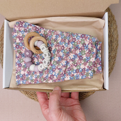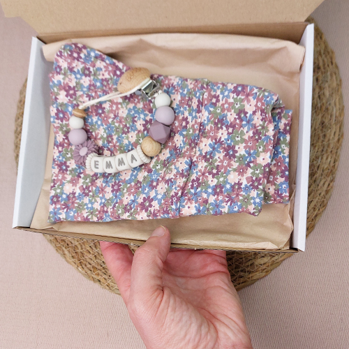 Het unieke samengestelde brievenbus kraamcadeau met naam  is een perfect kraamcadeau? Door de naam van de baby op de bijtring en/of het speenkoord toe te voegen maak je er een uniek cadeau van.  Het brievenbus kraamcadeau met naam babybroekje bloemen mauve is speciaal door mij samengesteld en ontworpen in mijn eigen atelier.