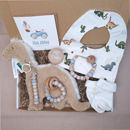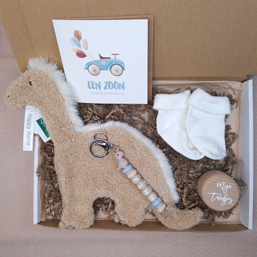 Stuur een lief en persoonlijk brievenbus kraamcadeau voor een jongetje met Happy Horse dino. Breid het eventueel uit met een speenkoord of bijtring met naam, sleutelhanger of babyslab voor een compleet cadeau.