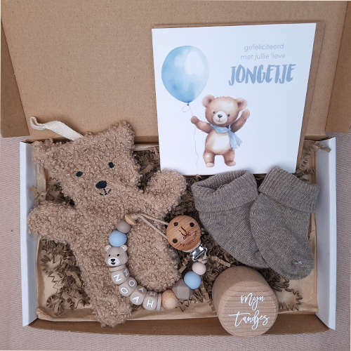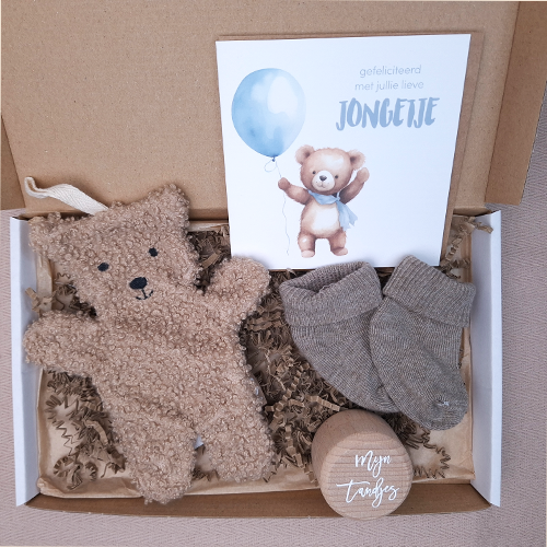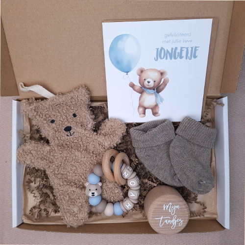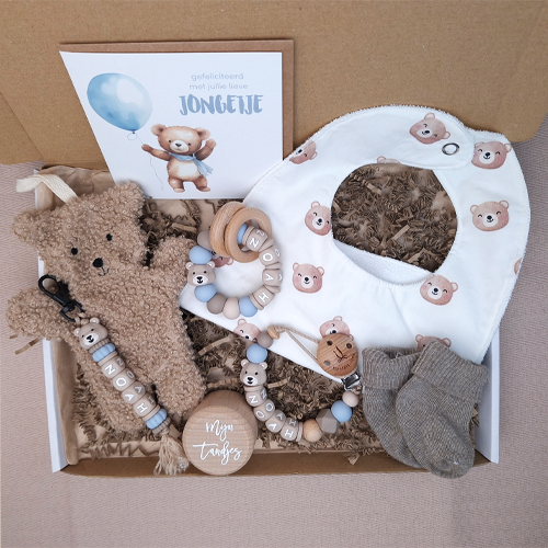 Stuur een lief en persoonlijk brievenbus kraamcadeau voor een jongetje met speendoekje beer. Breid het eventueel uit met een speenkoord of bijtring met naam, sleutelhanger of babyslab voor een compleet cadeau.