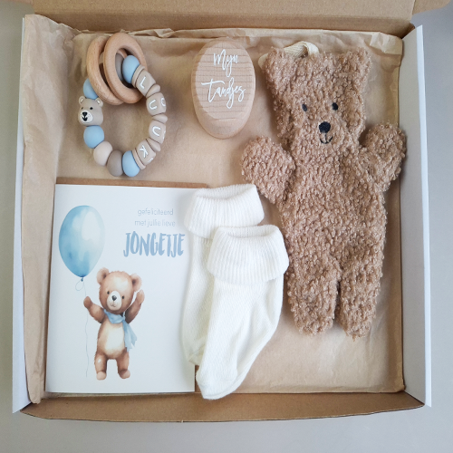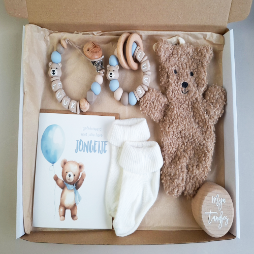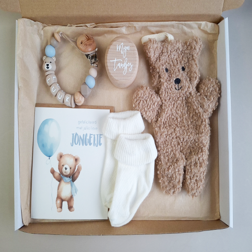 Brievenbus kraamcadeau met naam speendoekje beer waterdamp