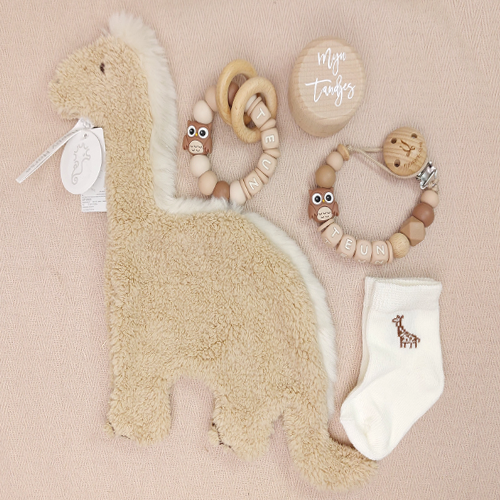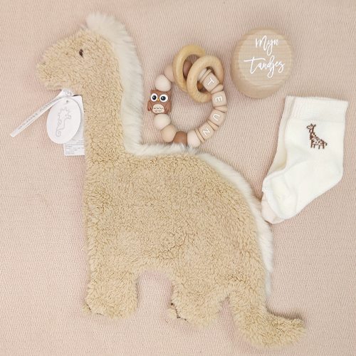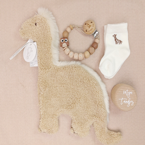 Is er een baby geboren en wil jij de kersverse ouders verrassen met een origineel en persoonlijk kraamcadeau per post? Kies dan voor dit mooie brievenbuscadeau met knuffeldoekje dino happy horse! Je kunt zelf kiezen uit: een bijtring, speenkoord of allebei, natuurlijk met de naam van de baby. Het past gewoon door de brievenbus en valt als verrassing op de deurmat. Een lief en praktisch cadeautje waar ouders echt iets aan hebben.