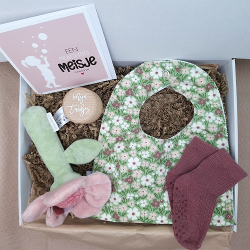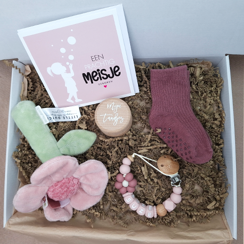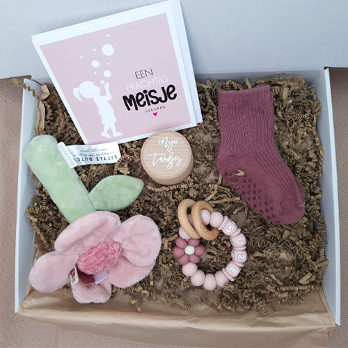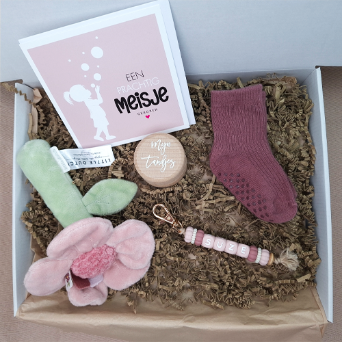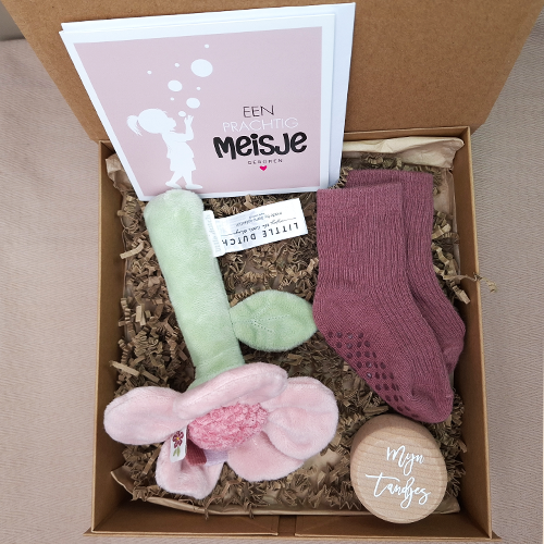 Verras de kersverse ouders met dit persoonlijke kraamcadeau voor een meisje met een Little dutch knuffelrammelaar bloem licht roze, babysokjes, een tandendoosje en een dubbele wenskaart. Maak het cadeau extra bijzonder met een speenkoord of bijtring met naam, sleutelhanger of babyslab. Alles wordt feestelijk verpakt en als pakketpost verzonden. Een uniek, praktisch en liefdevol kraamcadeau dat écht gebruikt wordt.