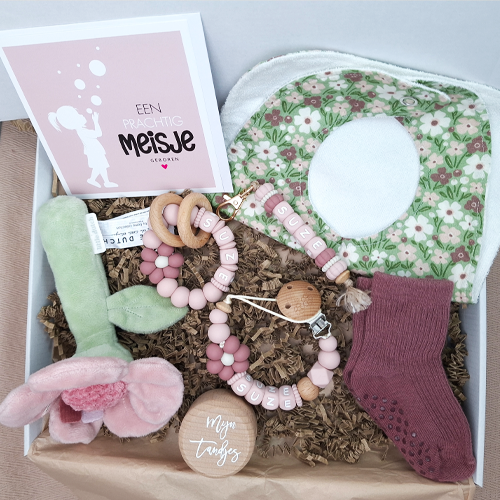 Een brievenbuskraamcadeau bevat zorgvuldig gekozen babyproducten, zoals een speenkoord, bijtring of hydrofiele doek. Alles wordt feestelijk verpakt.