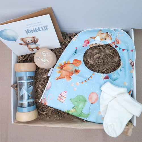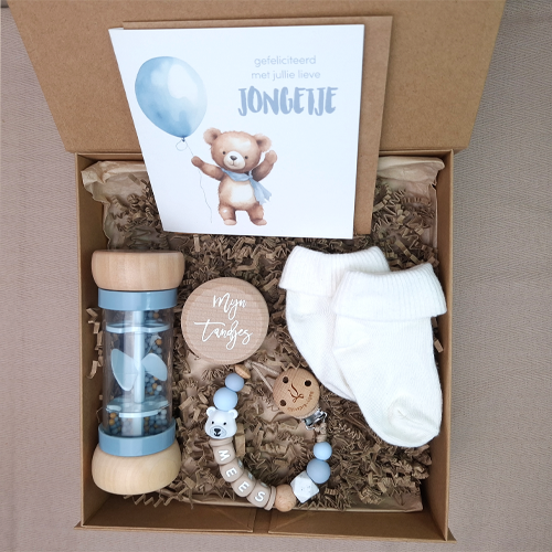 Wij verpakken alles feestelijk en voegen standaard een dubbele wenskaart toe. Tijdens het afrekenen kun je een persoonlijke boodschap achterlaten in het opmerkingen veld en het bezorgadres aanpassen in het winkelmandje. Zo stuur je het kraamcadeau rechtstreeks naar de kersverse ouders.