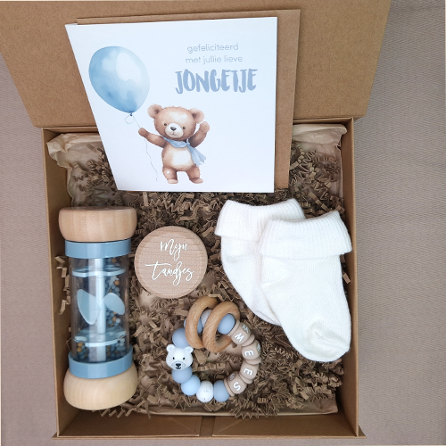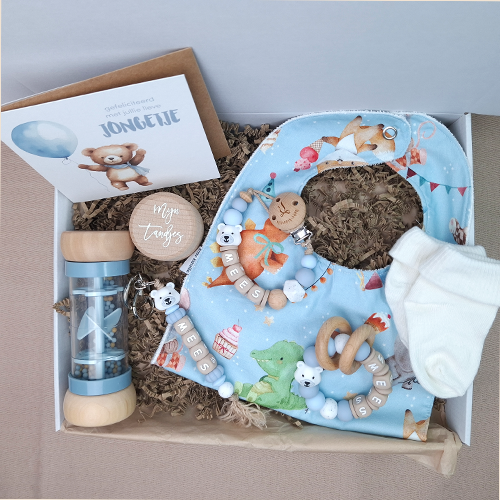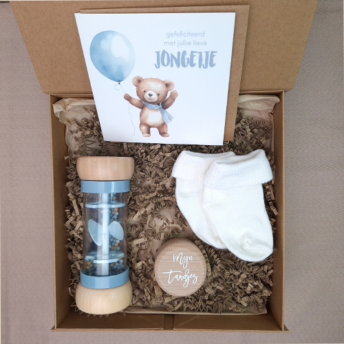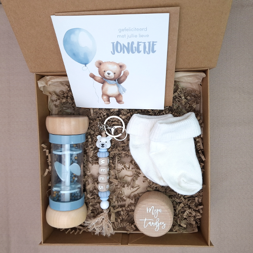 Verras de kersverse ouders met dit persoonlijke kraamcadeau voor een jongentje met een Little dutch regenrammelaar, babysokjes, een tandendoosje en een dubbele wenskaart. Maak het cadeau extra bijzonder met een speenkoord of bijtring met naam, sleutelhanger of babyslab. Alles wordt feestelijk verpakt en als pakketpost verzonden. Een uniek, praktisch en liefdevol kraamcadeau dat echt gebruikt wordt.