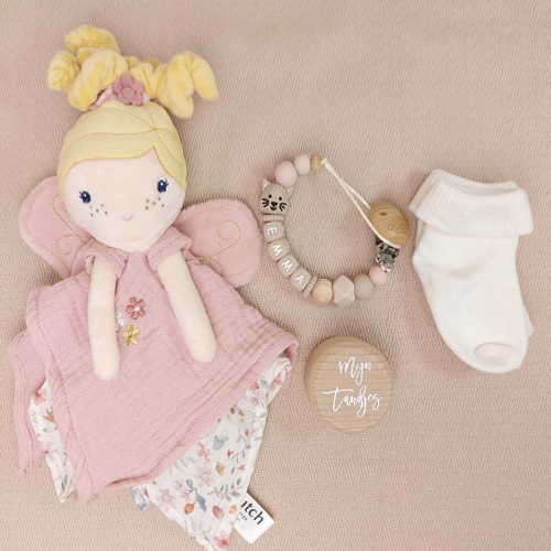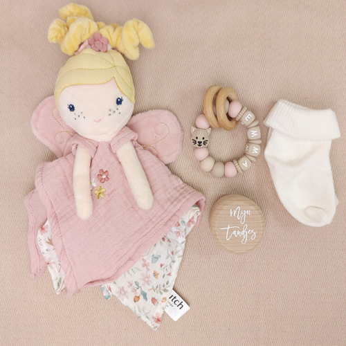 Laat je kleintje wegdromen in een wereld vol vrolijke bloemen met dit prachtige feeën knuffeldoekje. Haar zachte vleugels, geborduurde details, blonde haren en lichtroze jurkje maken haar perfect voor kleine handjes om vast te pakken en te knuffelen. Deze fee stimuleert de zintuigen en biedt comfort en geborgenheid. Ideaal voor dutjes of onderweg!
