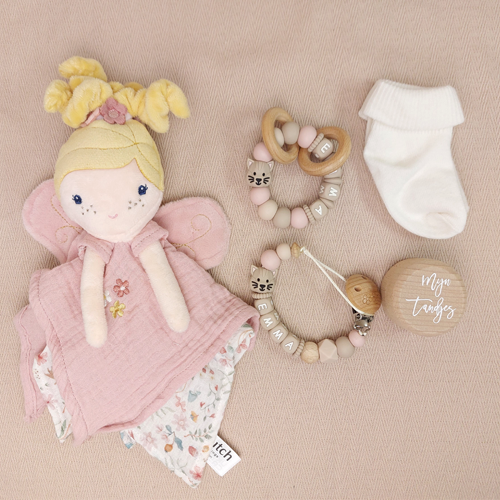 Het unieke samengestelde kraamcadeau met naam knuffeldoekje mila is een perfect kraamcadeau? Door de naam van de baby toe te voegen, maak je er echt iets unieks van. Deze handgemaakte bijtring en/of speenkoord ontwerp en stel ik met liefde zelf samen in mijn eigen atelier.