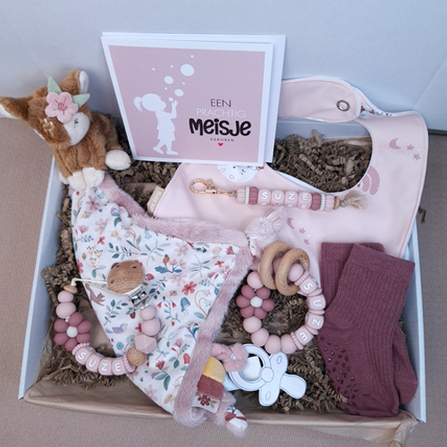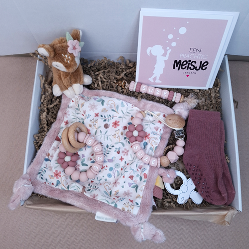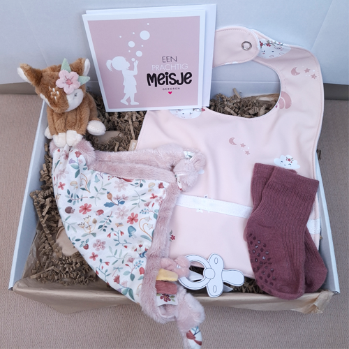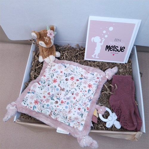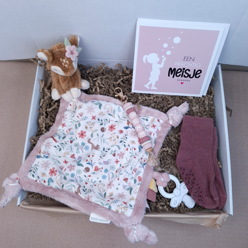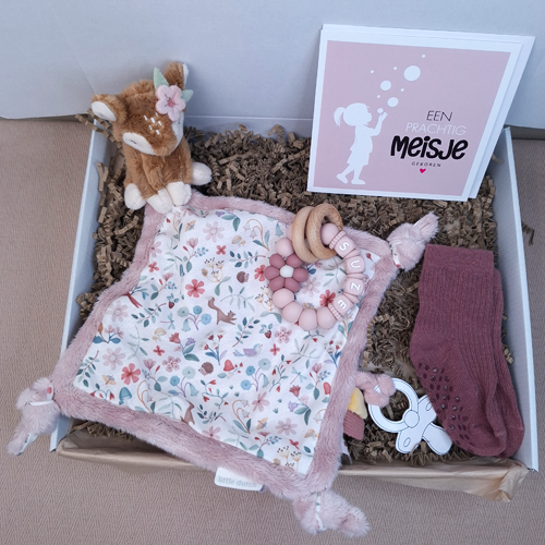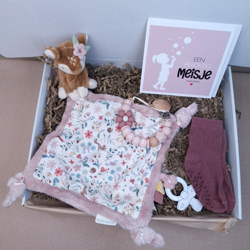Verras de kersverse ouders met dit persoonlijke kraamcadeau voor een meisje met een Little dutch speendoekje hert, babysokjes en een dubbele wenskaart. Breid het eventueel uit met een speenkoord of bijtring met naam, sleutelhanger of babyslab voor een compleet kraamcadeau met naam meisje.