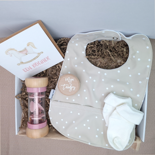 Dit is een speciaal samengesteld kraamcadeau dat door de brievenbus past. Ideaal om iemand te verrassen zonder dat de ontvanger thuis hoeft te zijn.