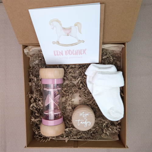 Wij verpakken alles feestelijk en voegen standaard een dubbele wenskaart toe. Tijdens het afrekenen kun je een persoonlijke boodschap achterlaten in het opmerkingen veld  en het bezorgadres aanpassen in het winkelmandje. Zo stuur je het kraamcadeau rechtstreeks naar de kersverse ouders.