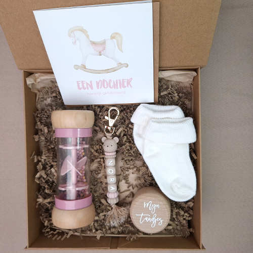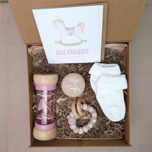 Verras de kersverse ouders met dit persoonlijke kraamcadeau voor een meisje met een Little dutch regenrammelaar, babysokjes, een tandendoosje en een dubbele wenskaart. Maak het cadeau extra bijzonder met een speenkoord of bijtring met naam, sleutelhanger of babyslab. Alles wordt feestelijk verpakt en als pakketpost verzonden. Een uniek, praktisch en liefdevol kraamcadeau dat écht gebruikt wordt.