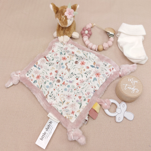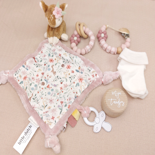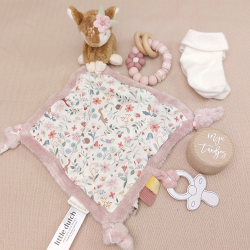 Dit vrolijke unieke kraamcadeau bevat een kleurrijke zachte speendoekje hert roze van Little Dutch, een speenkoord en een bijtring, allemaal gepersonaliseerd met de naam van de baby. Alles is handgemaakt van gecertificeerde, veilige materialen en voldoet aan de Europese wetgeving. Een perfect en origineel kraamcadeau voor een pasgeboren baby!