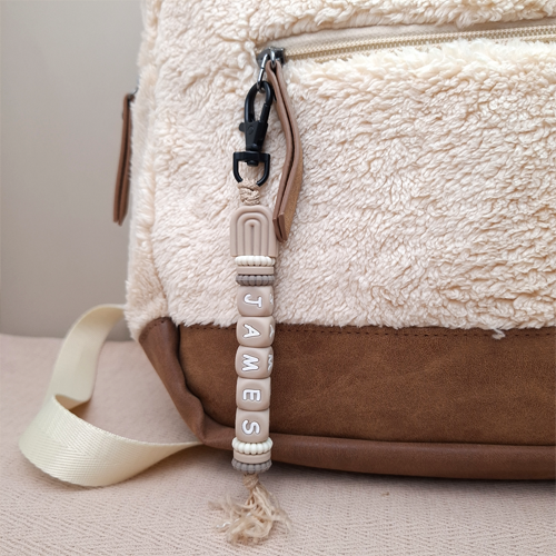 Maak je tas of sleutelbos uniek met deze handgemaakte sleutelhanger met naam van Baby-kidsvilla. Perfect voor aan de luiertas, tas voor peuterspeelzaal, kinderdagverblijf of gastouder, schooltas of de sleutelbos van papa en mama. Gemaakt van veilig, duurzaam en kindvriendelijk materiaal, volledig BPA- en ftalaatvrij.