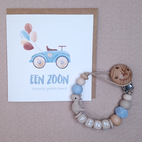 Wil je van het speenkoord met naam een nog completer kraamcadeau maken? Dat kan! Je kunt eenvoudig een bijpassend product toevoegen, zodat je een mooi en persoonlijk cadeausetje samenstelt. Dit is helemaal vrijblijvend, je kunt het speenkoord ook gewoon los bestellen.
