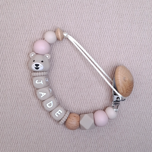 Een gepersonaliseerde speenkoord is niet alleen praktisch, maar ook een stijlvol accessoire bij elke outfit. De zachte kleuren Beer beige, licht oudroze en latte geven een lieve, rustige uitstraling en maken het tot een geliefd kraamcadeautje dat door kersverse ouders enorm wordt gewaardeerd.