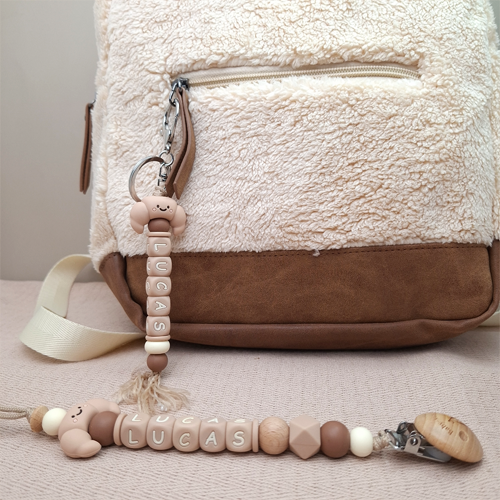 Nooit meer een speen kwijt! Dit gepersonaliseerde speenkoord houdt de speen van je baby altijd binnen handbereik, veilig en stijlvol. De zachte kleuren Croissant havermout, melkchocolade en ivory maken het speenkoord een mooie aanvulling op elke outfit van jouw jongentje. Perfect voor thuis, onderweg of tijdens een wandeling met de kinderwagen.