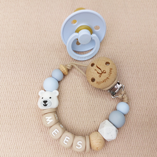 Het speenkoord met naam ijsbeer, is een perfect kraamcadeau. Door de naam van de baby toe te voegen, maak je er echt iets unieks van. Deze handgemaakte speenkoord ontwerp en stel ik met liefde zelf samen in mijn eigen atelier.