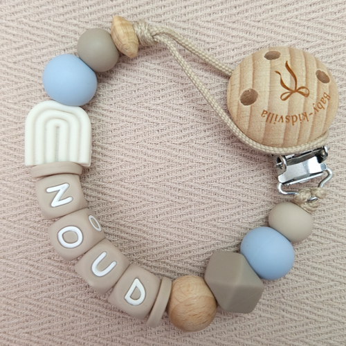 Het speenkoord met naam maakt het leven met je baby een stuk makkelijker. Nooit meer speentjes die op de grond vallen of kwijtraken! Dankzij de stevige houten speenclip bevestig je het speenkoord eenvoudig aan de kleding van je baby, zodat de speen altijd binnen handbereik is. Thuis, onderweg of tijdens een wandeling met de kinderwagen: dit speenkoord is altijd praktisch en stijlvol.