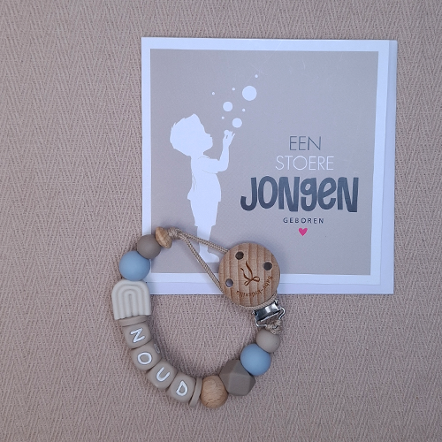 Elk speenkoord met naam wordt met zorg handgemaakt door creatieve ondernemer Mirjam in haar eigen atelier. De materialen zijn volledig gecertificeerd en het speenkoord is getest volgens de Europese normen (NEN‑12586). De siliconen kralen zijn BPA-, ftalaten-, lood- en PVC‑vrij, de houten kraal en speenclip duurzaam en verantwoord.