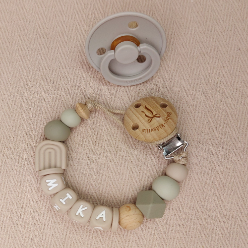 Het speenkoord met naam regenboog salie, is een perfect kraamcadeau.  Door de naam van de baby toe te voegen, maak je er echt iets unieks van. Deze handgemaakte speenkoord ontwerp en stel ik met liefde zelf samen in mijn eigen atelier.