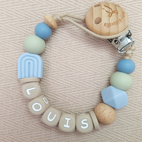 Het speenkoord met naam maakt het leven met je baby een stuk makkelijker. Nooit meer speentjes die op de grond vallen of kwijtraken! Dankzij de stevige houten speenclip bevestig je het speenkoord eenvoudig aan de kleding van je baby, zodat de speen altijd binnen handbereik is. Thuis, onderweg of tijdens een wandeling met de kinderwagen: dit speenkoord is altijd praktisch en stijlvol.