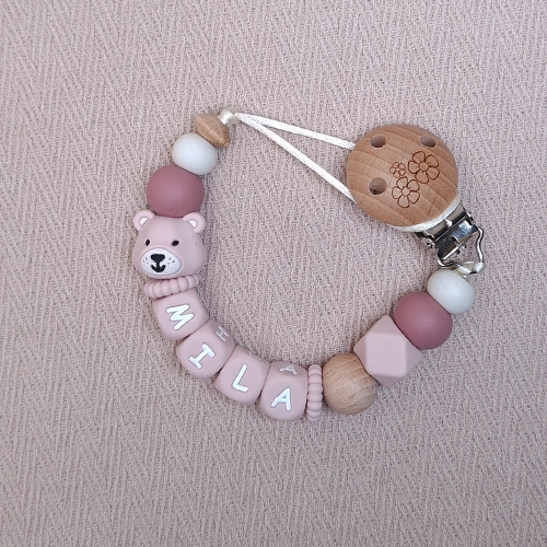 Nooit meer een speen kwijt! Dit gepersonaliseerde speenkoord houdt de speen van je baby altijd binnen handbereik, veilig én stijlvol. De zachte kleuren Beer licht oudroze, donker oudroze en room maken het speenkoord een mooie aanvulling op elke outfit van jouw meisje. Perfect voor thuis, onderweg of tijdens een wandeling met de kinderwagen.