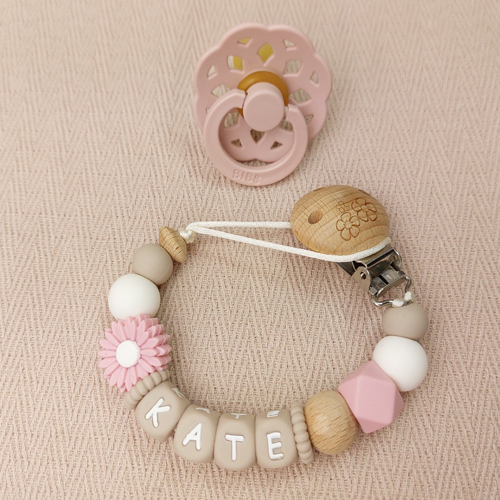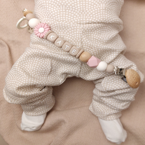 Het speenkoord met naam daisy bloesem, is een perfect geboortecadeau. Door de naam van de baby toe te voegen, maak je er echt iets unieks van. Deze handgemaakte speenkoord ontwerp en stel ik met liefde zelf samen in mijn eigen atelier.