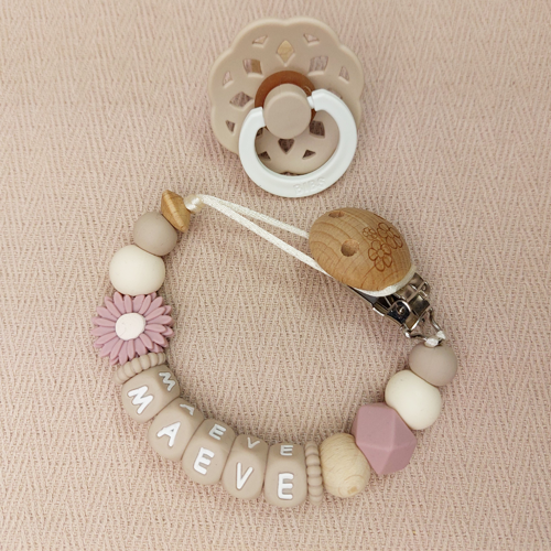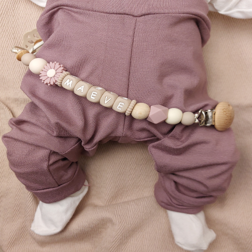 Het speenkoord met naam meisje daisy wood is ideaal voor ouders die nooit meer een speentje kwijt willen raken. Dankzij de stevige houten speenclip blijft het speentje altijd schoon en binnen handbereik aan de bijpassende oitfit, onderweg of tijdens een wandeling. Het persoonlijke speenkoord met naam is praktisch en een uniek kraamcadeau waar ouders blij van worden.