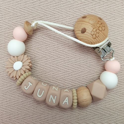 Het speenkoord met naam maakt het leven met je baby een stuk makkelijker. Nooit meer speentjes die op de grond vallen of kwijtraken! Dankzij de stevige houten speenclip bevestig je het speenkoord eenvoudig aan de kleding van je baby, zodat de speen altijd binnen handbereik is. Thuis, onderweg of tijdens een wandeling met de kinderwagen: dit speenkoord is altijd praktisch en stijlvol.