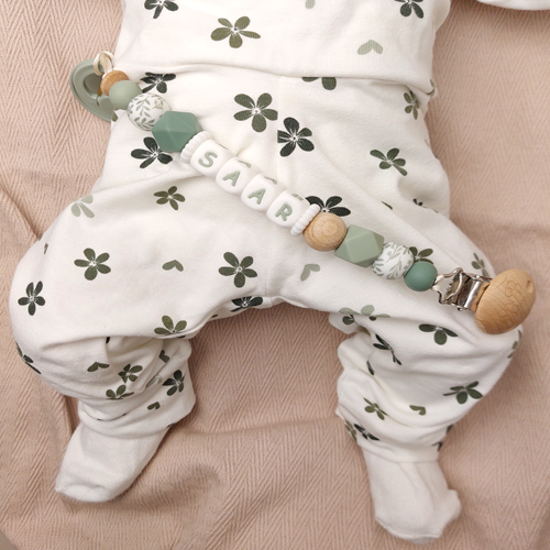 Het speenkoord met naam flower oudgroen, is een perfect kraamcadeau. Door de naam van de baby toe te voegen, maak je er echt iets unieks van. Deze handgemaakte speenkoord ontwerp en stel ik met liefde zelf samen in mijn eigen atelier.