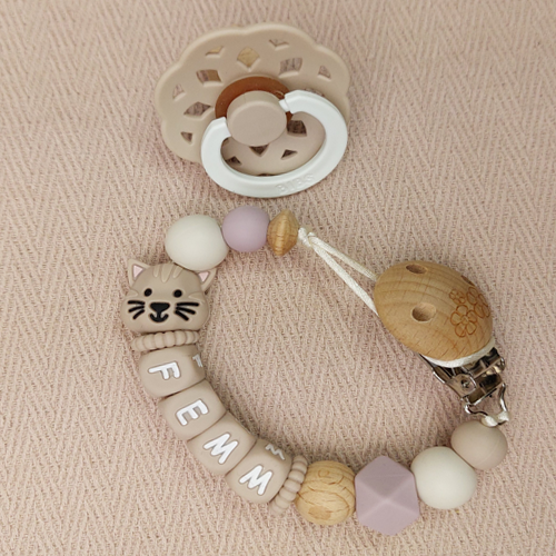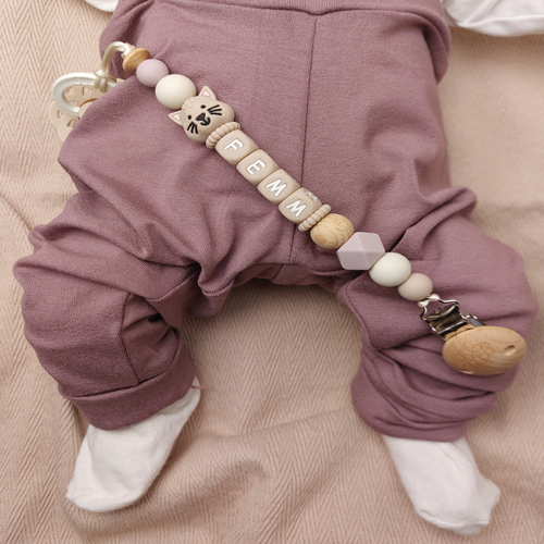Het speenkoord met naam meisje poes mist in paarse tinten is ideaal voor ouders die nooit meer een speentje kwijt willen raken. Dankzij de stevige houten speenclip blijft het speentje altijd schoon en binnen handbereik aan de bijpassende oitfit, onderweg of tijdens een wandeling. Het persoonlijke speenkoord met naam is praktisch en een uniek kraamcadeau waar ouders blij van worden.