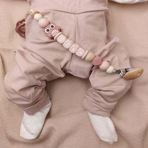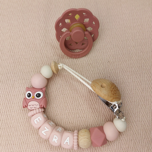 Het speenkoord met naam uil donker oudroze, is een perfect gkraamcadeau. Met de persoonlijke touch de naam van de baby op het speenkoord. Dit unieke handgemaakte speenkoord wordt speciaal door mij ontworpen en samengesteld in mijn eigen atelier.