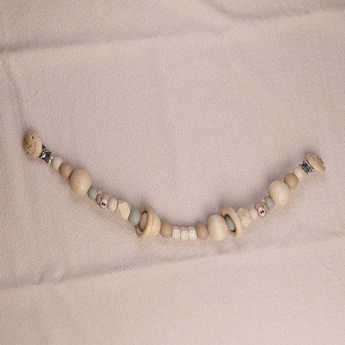 - Materiaal: Hoogwaardige, gecertificeerde siliconen kralen die BPA-vrij, ftalaten-vrij, lood- en PVC-vrij zijn. Gecertificeerd beukenhouten kralen, ringen en speenclips